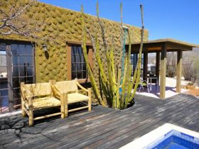 (Home with a cardones cactus growing through the deck, La Paz, Mexico, pictured.)